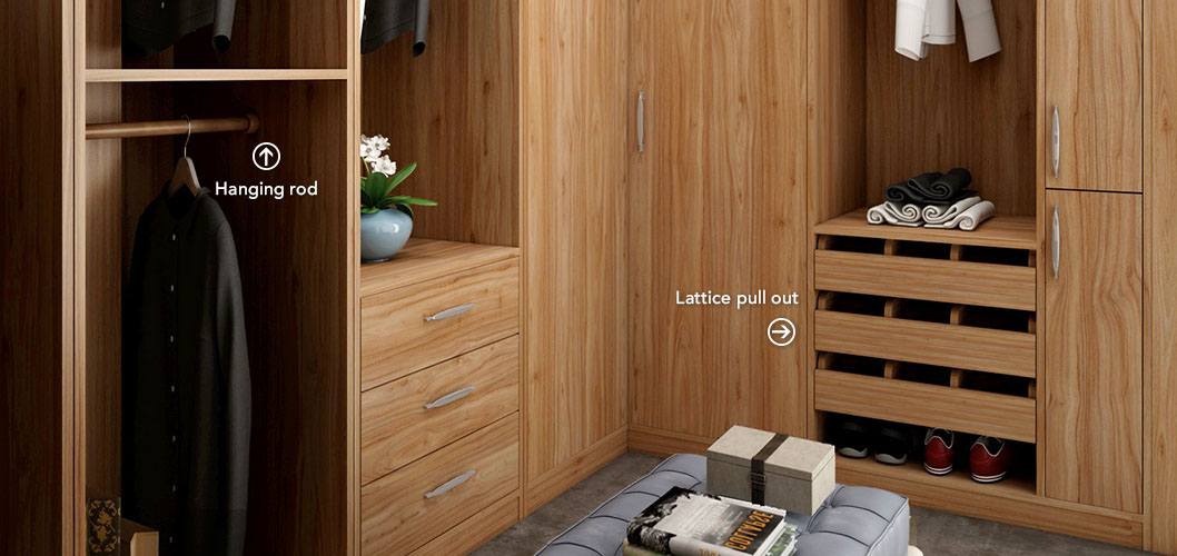 A U-shaped walking closet of walnut wood grain color brings us into a world of nature. With an ottoman in middle, just sit down to figure out what clothes to wear in the important negotiations or the wine party.