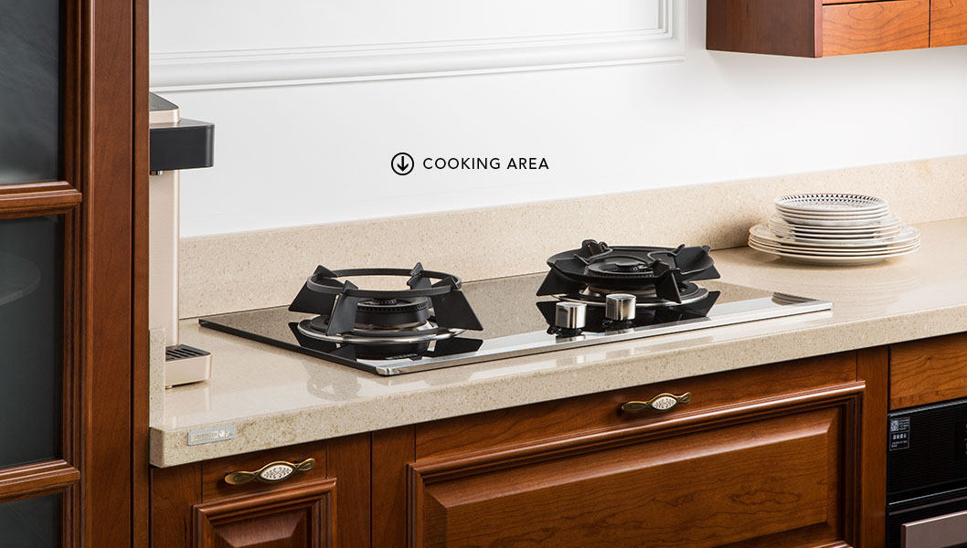 This dark wood cherry kitchen cabinet seems elegant and marvelous. L-shaped kitchen design makes full use of the space.