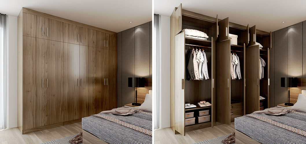 Light wood grain color wardrobe creates a warm and cozy surrounding for the bedroom.