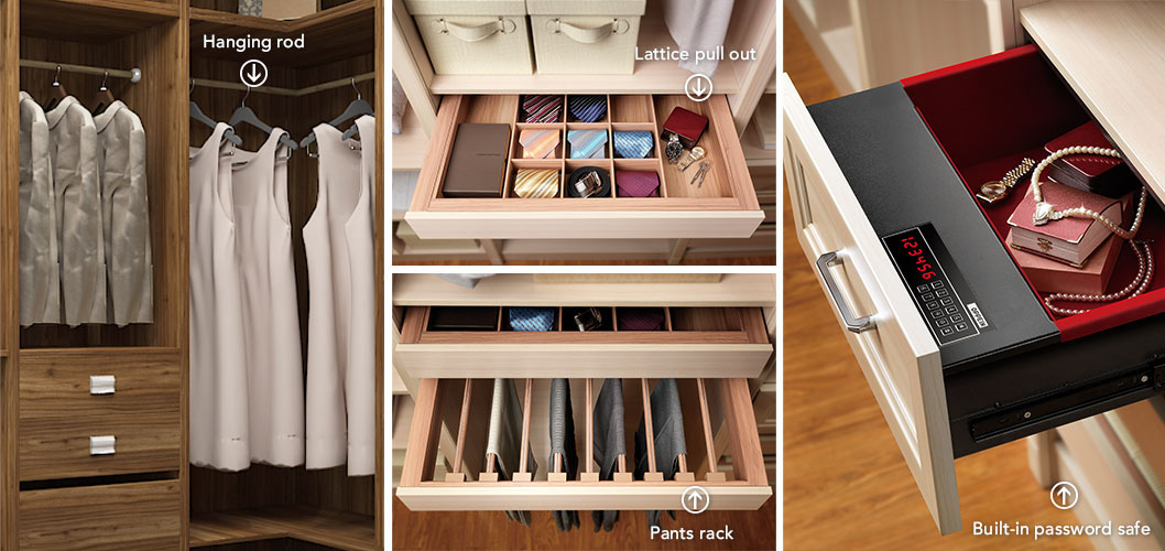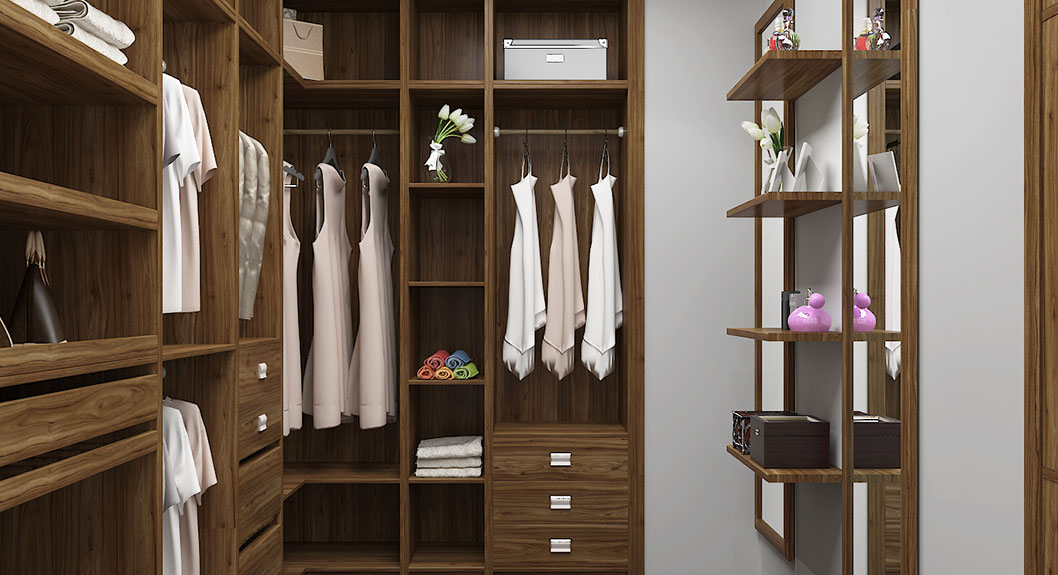 A U-shaped walking closet of walnut wood grain color brings us into a world of nature. With an ottoman in middle, just sit down to figure out what clothes to wear in the important negotiations or the wine party.