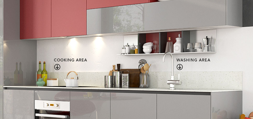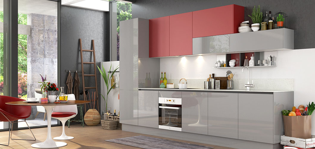 High gloss gray door panel looks smooth and excellent glossy. Adorned with small piece matte red panel, the whole cabinet seems stylish and energetic.